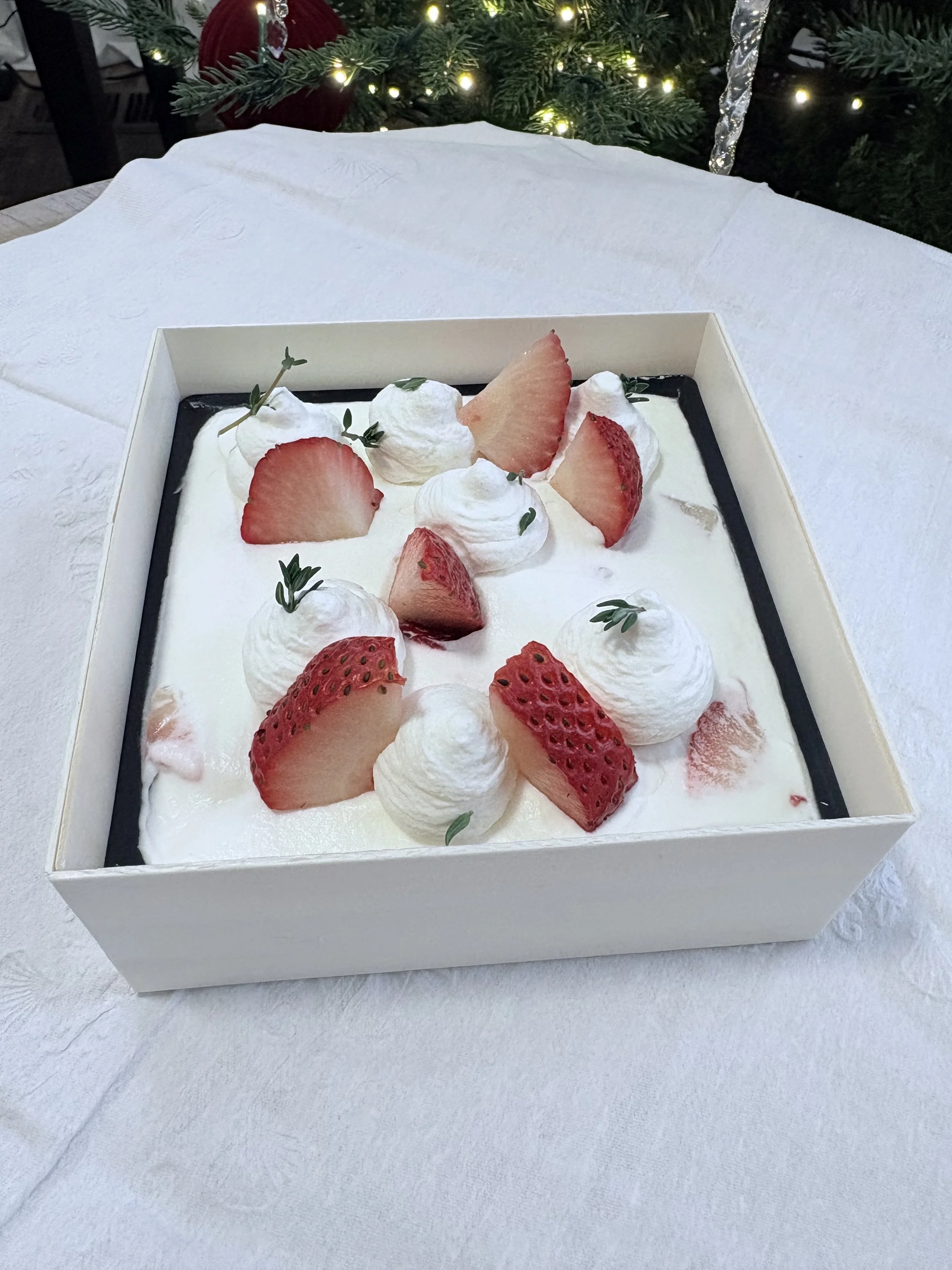 A light and airy vanilla cloud cake, generously filled and topped with fresh strawberries and silky smooth fresh cream.