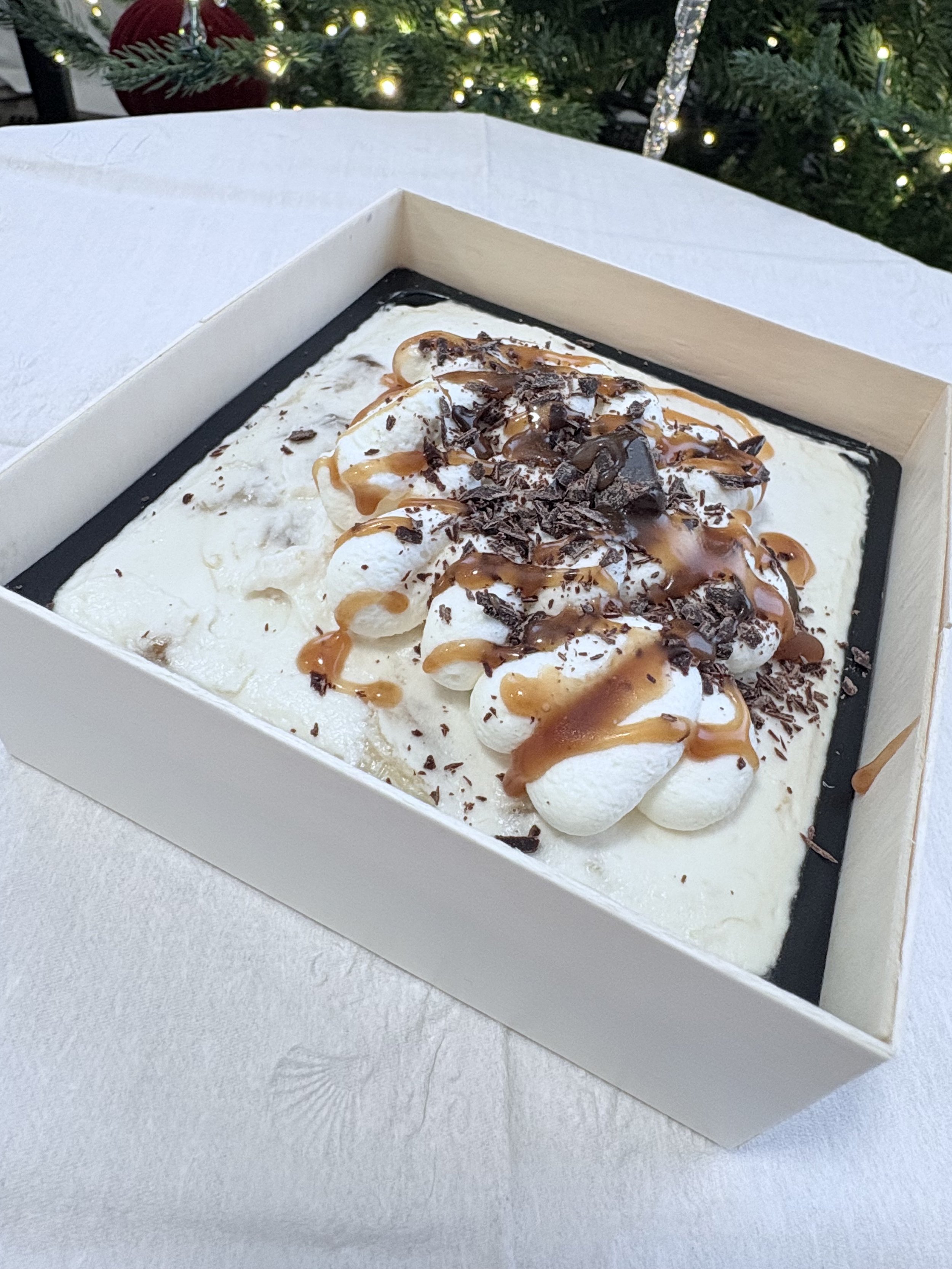 A fluffy chocolate cloud cake layered with smooth caramel banana cream, finished with a rich caramel drizzle and delicate chocolate shavings.