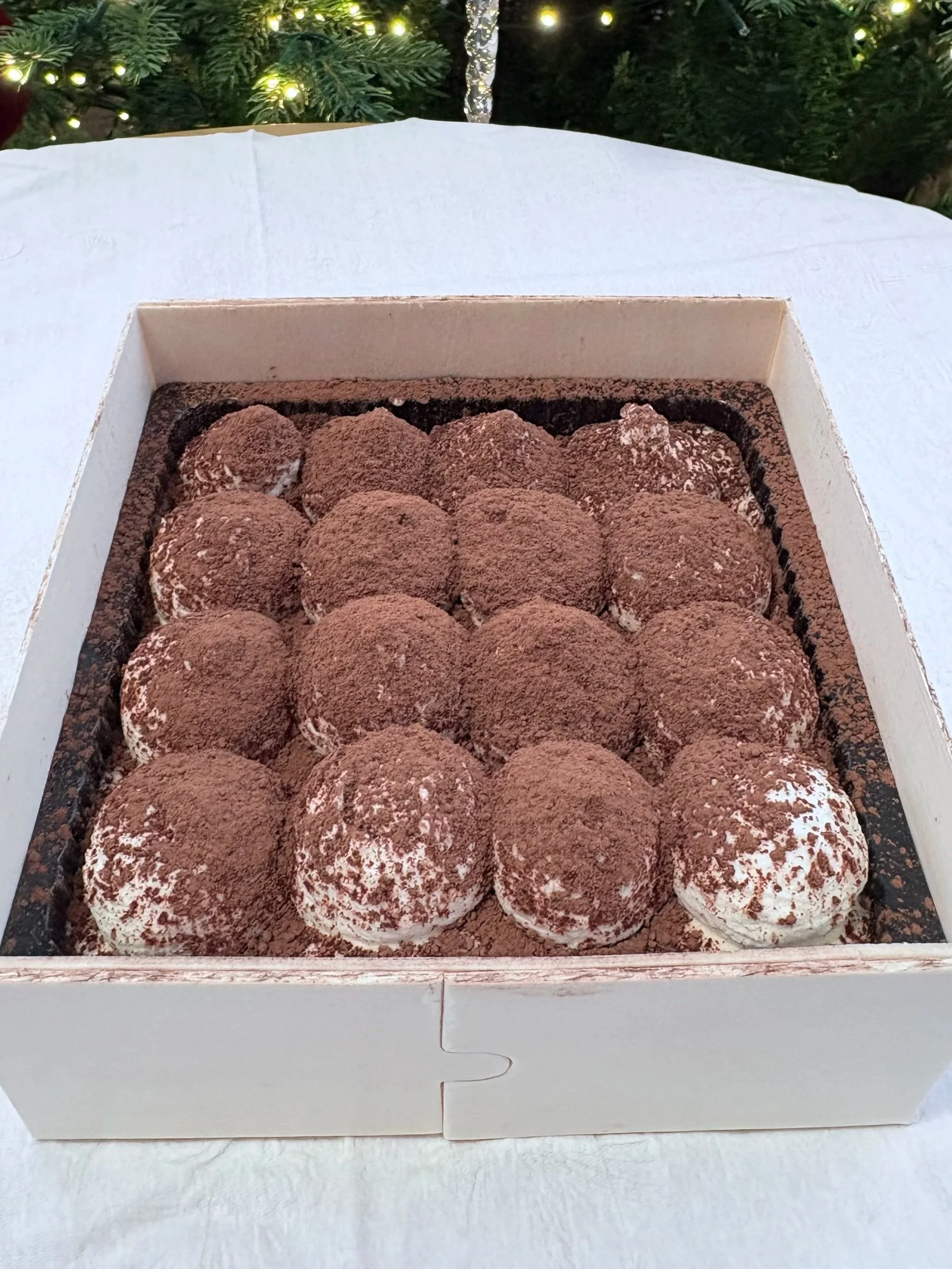 A soft vanilla cloud cake soaked in rich coffee, layered with smooth mascarpone cream, and finished with a light dusting of cocoa powder.